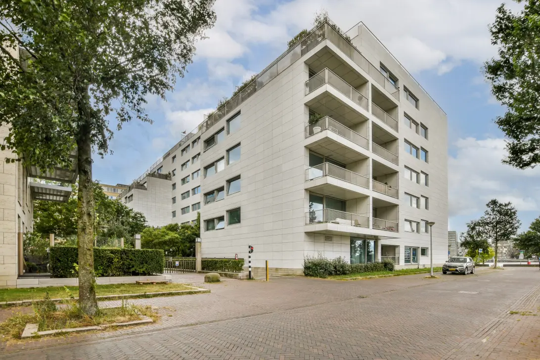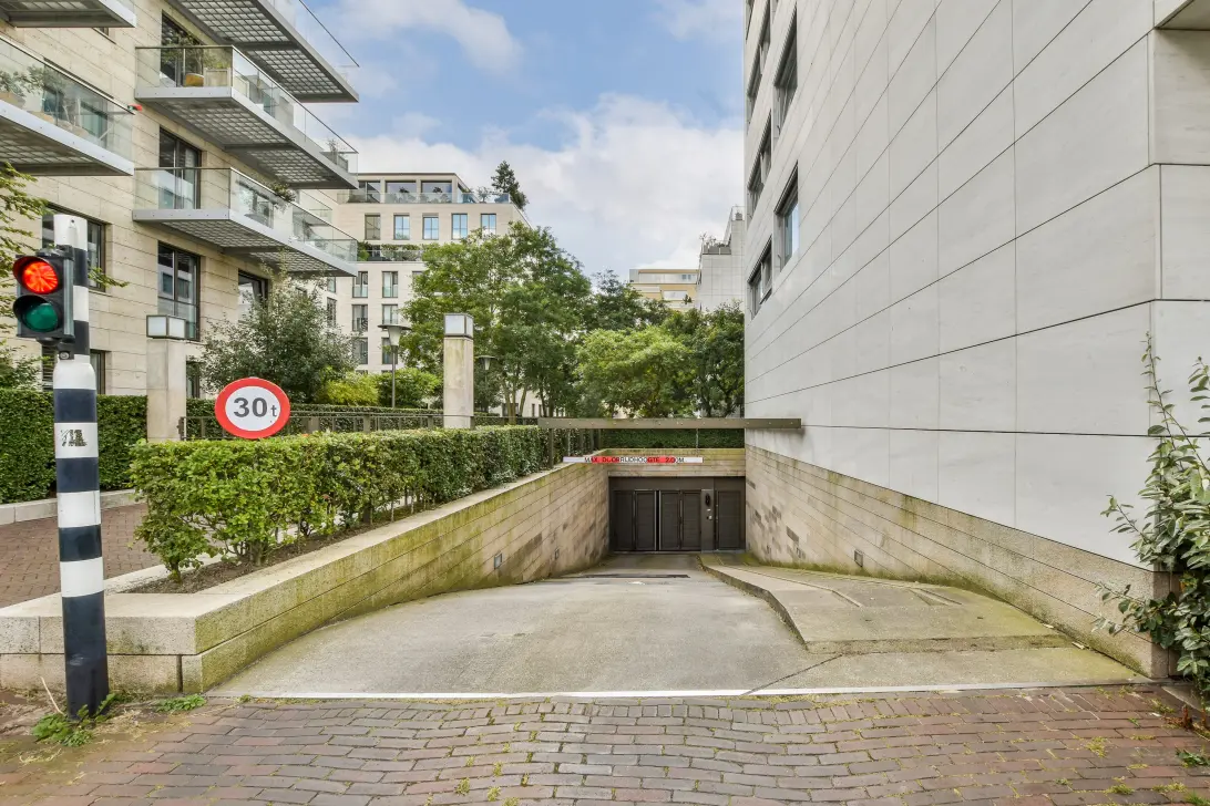 Parkeerplaats te koop in de onderbouw van het gebouw 'de Europa' aan de Overhoeksparklaan. De in- en uitrit van de parkeergarage bevinden zich aan de Bundlaan.