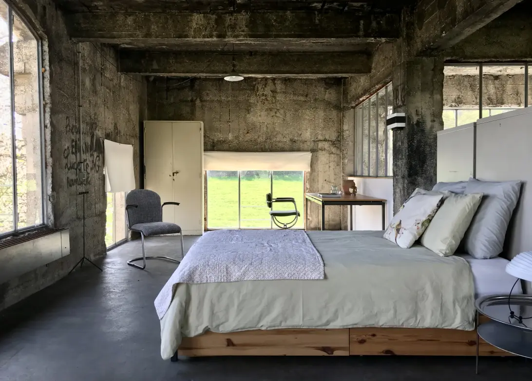 Hier vind je rust, ruimte, prachtige natuur en ongekende mogelijkheden om te wonen, werken en gasten te ontvangen in een ‘Brutalist gebouw’ uit 1923. Met een vloeroppervlakte van maar liefst 1500 m2, verdeeld over vijf verdiepingen en een zolder, is dit een gebouw met ongekende mogelijkheden. Momenteel zijn er twee lichte en ruime appartementen, een hele verdieping die momenteel wordt gebruikt voor recepties en yogalessen, en twee werkplaatsen van 250 m². En het uitzicht… onbeschrijfelijk mooi.