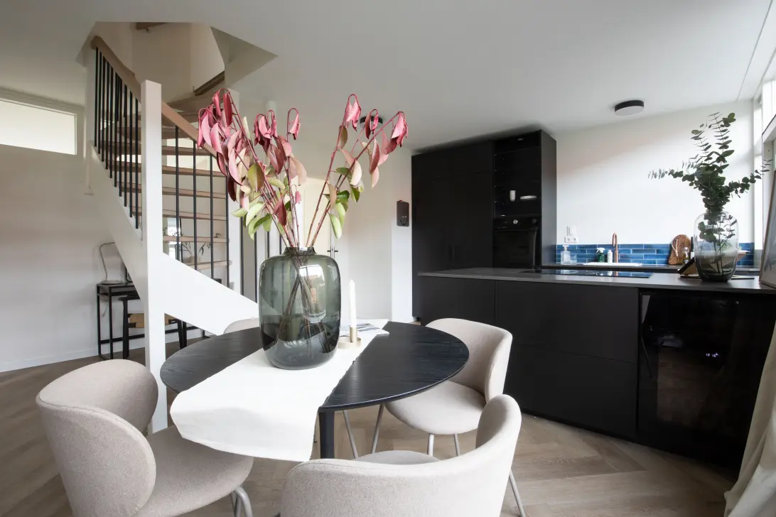 Aan de achterzijde bevindt zich de moderne open keuken, compleet uitgerust met hoogwaardige inbouwapparatuur: oven, vaatwasser, Quooker, koelkast, grote vriezer en magnetron. Het keukenblad is uitgevoerd in natuursteen. Het kookeiland met inductiekookplaat maakt de keuken tot een centraal en sfeervol middelpunt van de woning.