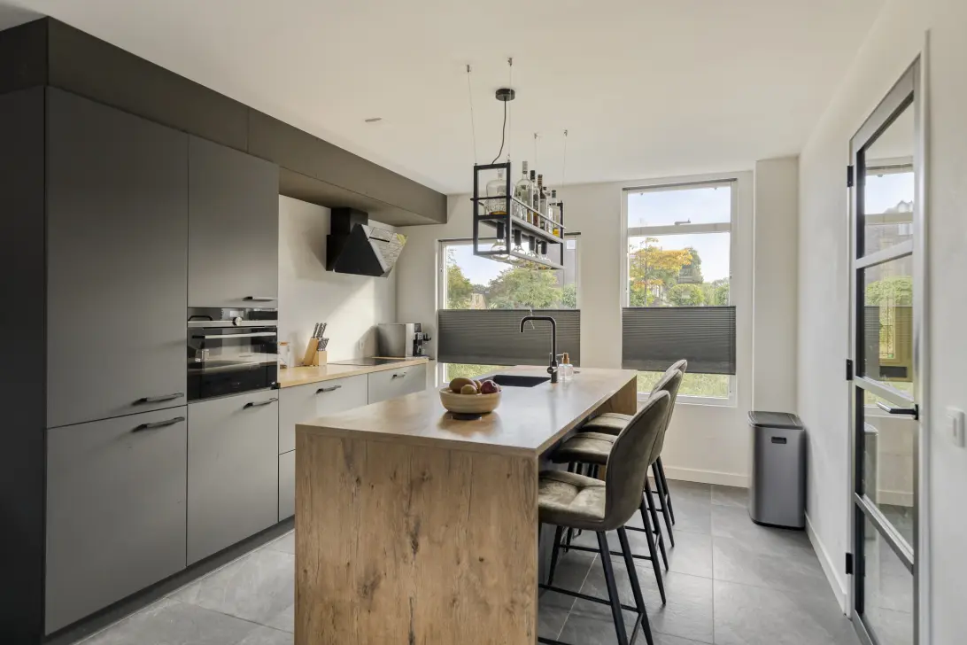 De open keuken bevindt zich aan de voorzijde van de woning. De keuken is uitgevoerd met fraai spoeleiland, een echte blikvanger. Alle moderne gemakken zijn aanwezig, als een inductiekookplaat, koel-vriescombinatie, combimagnetron en vaatwasser.