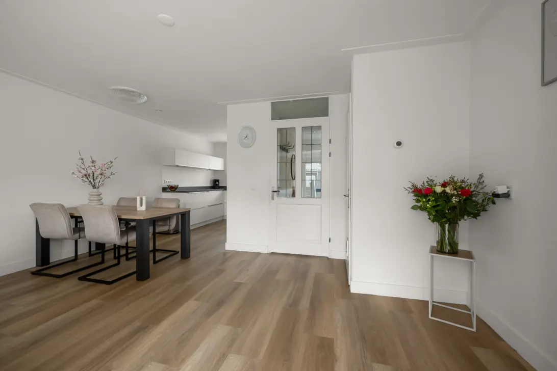 Via de verzorgde voortuin kom je binnen in de hal met toilet en trapopgang. De woonkamer is licht en ruim opgezet, met voldoende plaats voor een gezellige zithoek en een royale eethoek. De grote ramen zorgen voor een prettige lichtinval en een open sfeer. Aansluitend bevindt zich de keuken, praktisch ingericht en voorzien van diverse inbouwapparatuur. De begane grond is grotendeels voorzien van comfortabele vloerverwarming, wat bijdraagt aan een aangenaam woonklimaat.