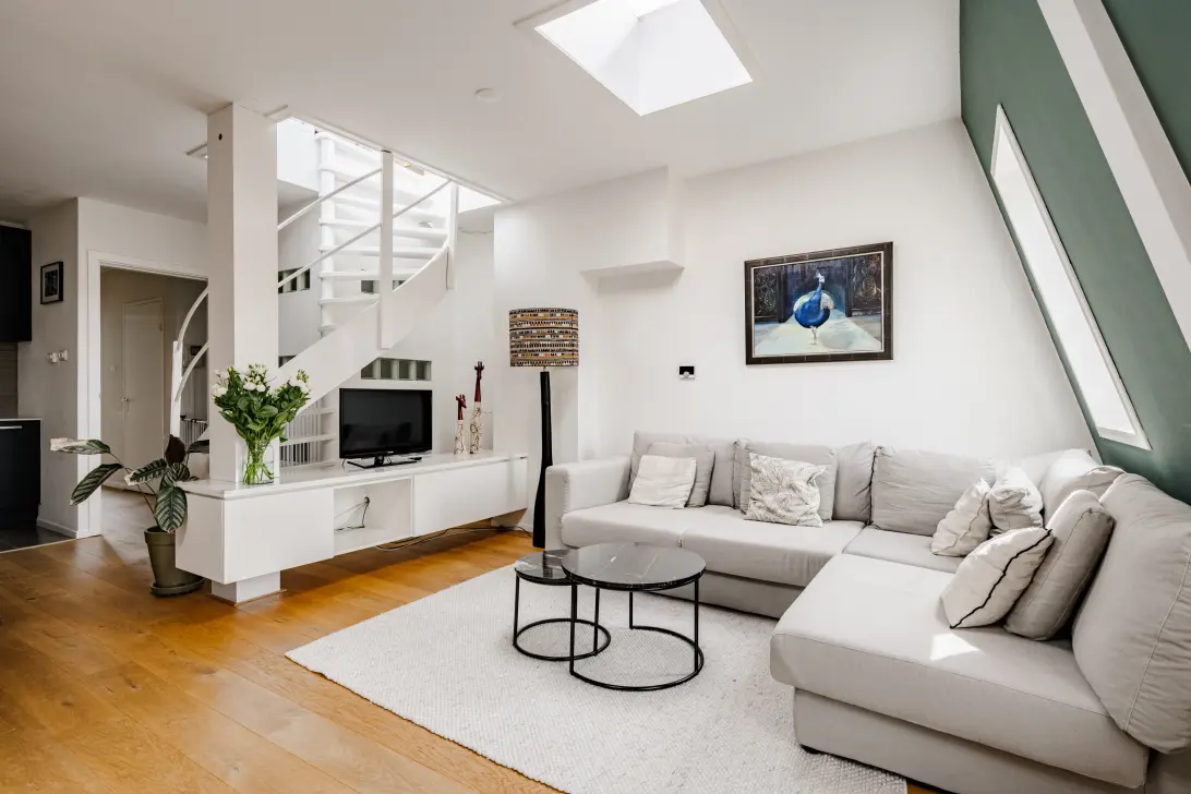 De vaste trap in de woonkamer leidt je naar de verrassend ruime dakopbouw met airco en openslaande deuren naar het grote dakterras. Hier geniet je van de zon, het uitzicht en de rust – maar toch ben je binnen enkele minuten midden in de stad.