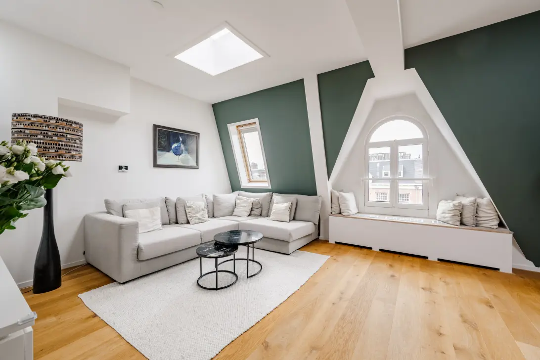 The fixed staircase in the living room leads to the surprisingly spacious rooftop extension with air conditioning and French doors opening onto the large roof terrace. Here you can enjoy the sun, the views, and the tranquility – all while being just minutes away from the city center.
