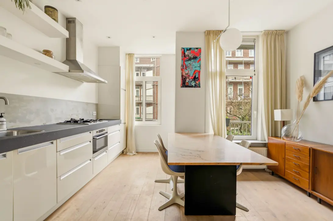 Aan de achterzijde van de woning ligt de keuken met plek voor een eettafel. De keuken staat in open verbinding met het eetgedeelte en is praktisch opgesteld langs de wand. Ook hier is een deur naar het tweede balkon aan de achterzijde, waar je heerlijk rustig zit.