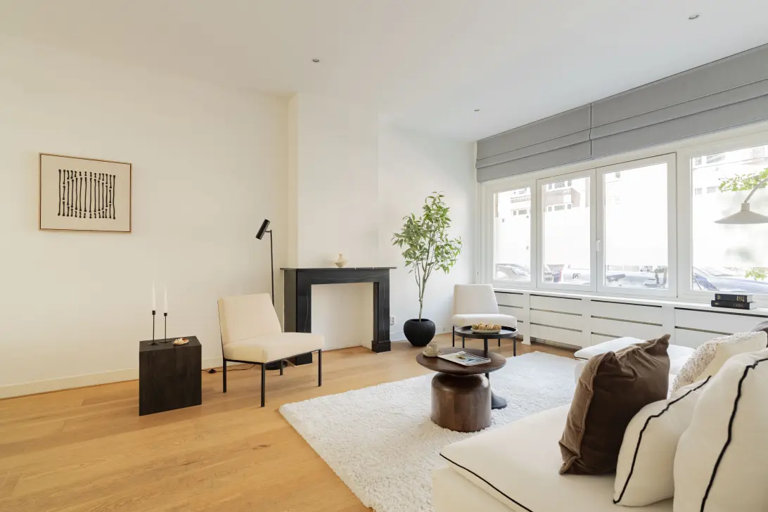 Via de eigen entree aan de Admiraal de Ruijterweg stap je binnen in een lichte en ruime woonkamer met hoge plafonds en een warme houten vloer. De ruimte met grote raampartijen zorgt voor een serene en fijne uitstraling, terwijl de stijlvolle schouw een beetje karakter toevoegt.
