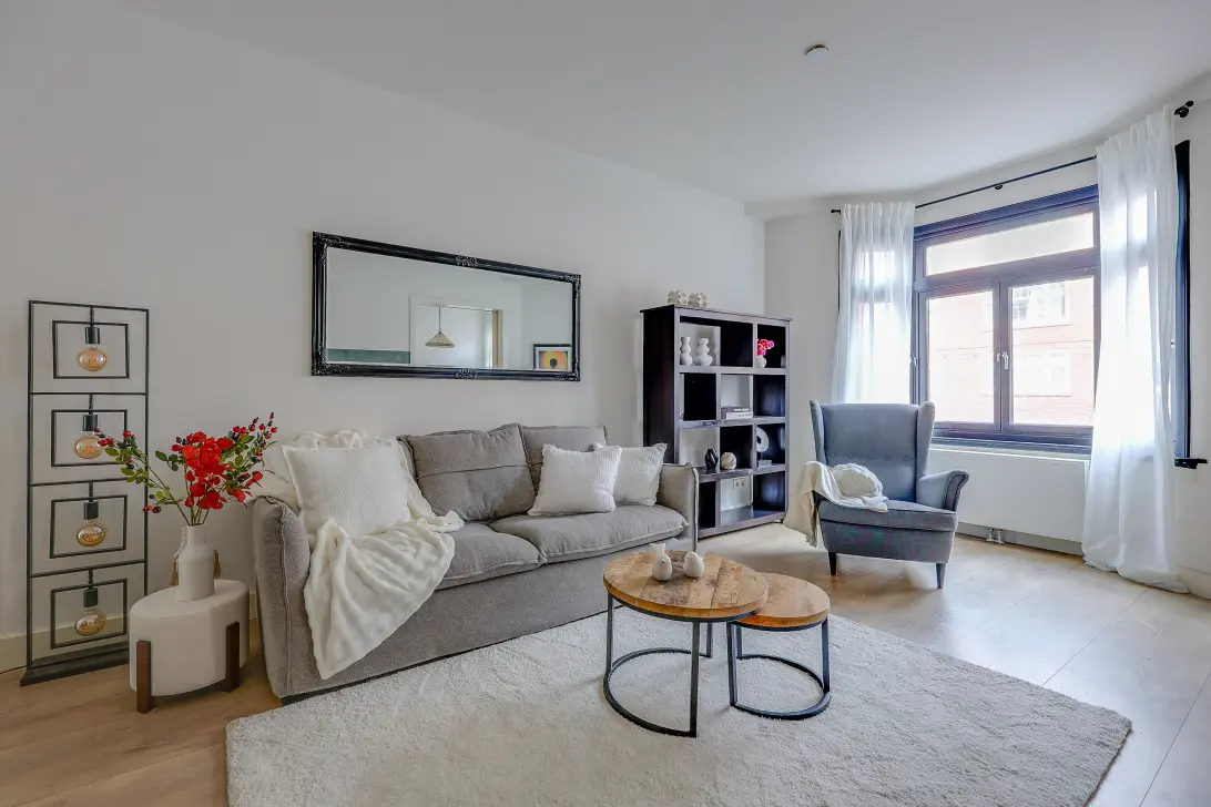 The main bedroom is also located at the garden side and includes an en-suite bathroom with a walk-in shower and washbasin. A separate toilet is accessible from the hallway, where you will also find a practical storage closet with a washing machine connection. The entire apartment is finished with a clean laminate floor.