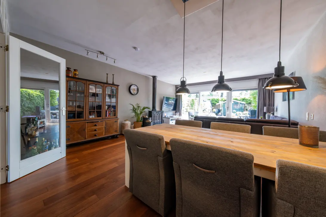 - Woonkamer met houtkachel en halfopen keuken met inbouwapparatuur;