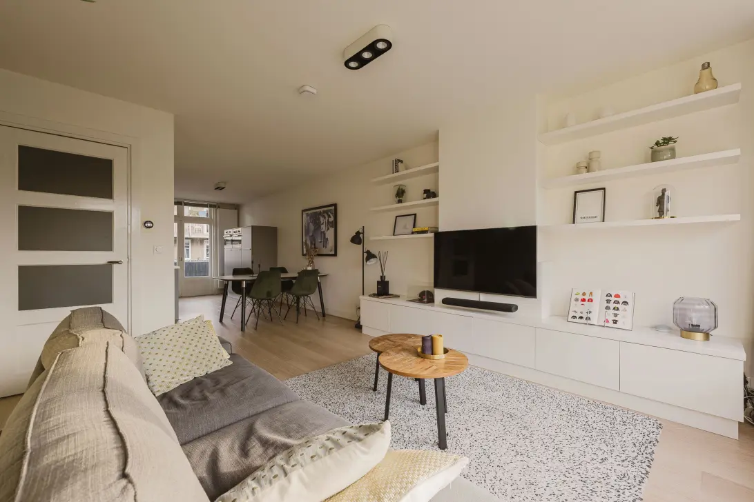 Het grote leefgedeelte voelt open en comfortabel aan en is strak afgewerkt met gestucte wanden, inbouwspots en een laminaatvloer door het hele appartement. De maatwerk tv-kast met planken blijft achter en vormt een stijlvolle eyecatcher. Vanuit de woonkamer is de zijkamer bereikbaar, momenteel in gebruik als kantoor, maar ook geschikt als kinderkamer.