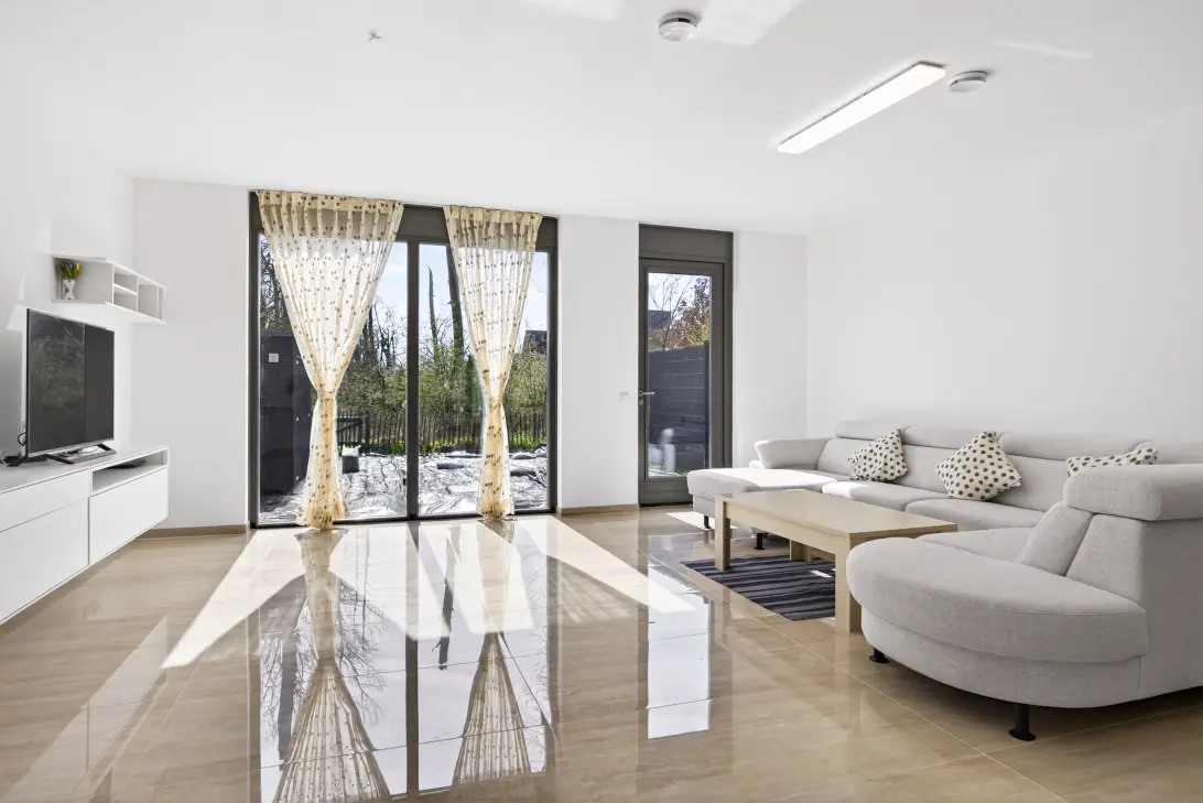 De wanden en plafonds zijn strak gestuct en de vloer is afgewerkt met hoogwaardige Italiaanse travertin tegels.
