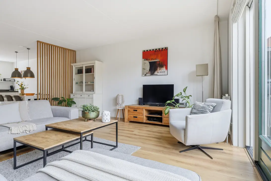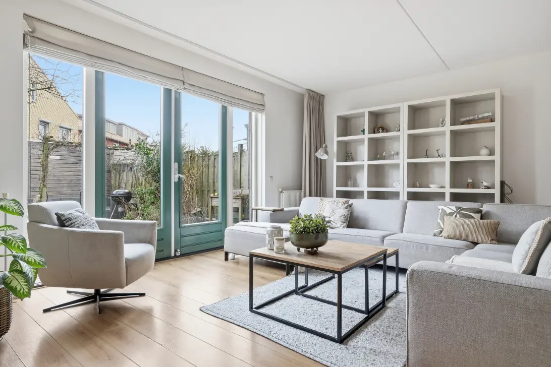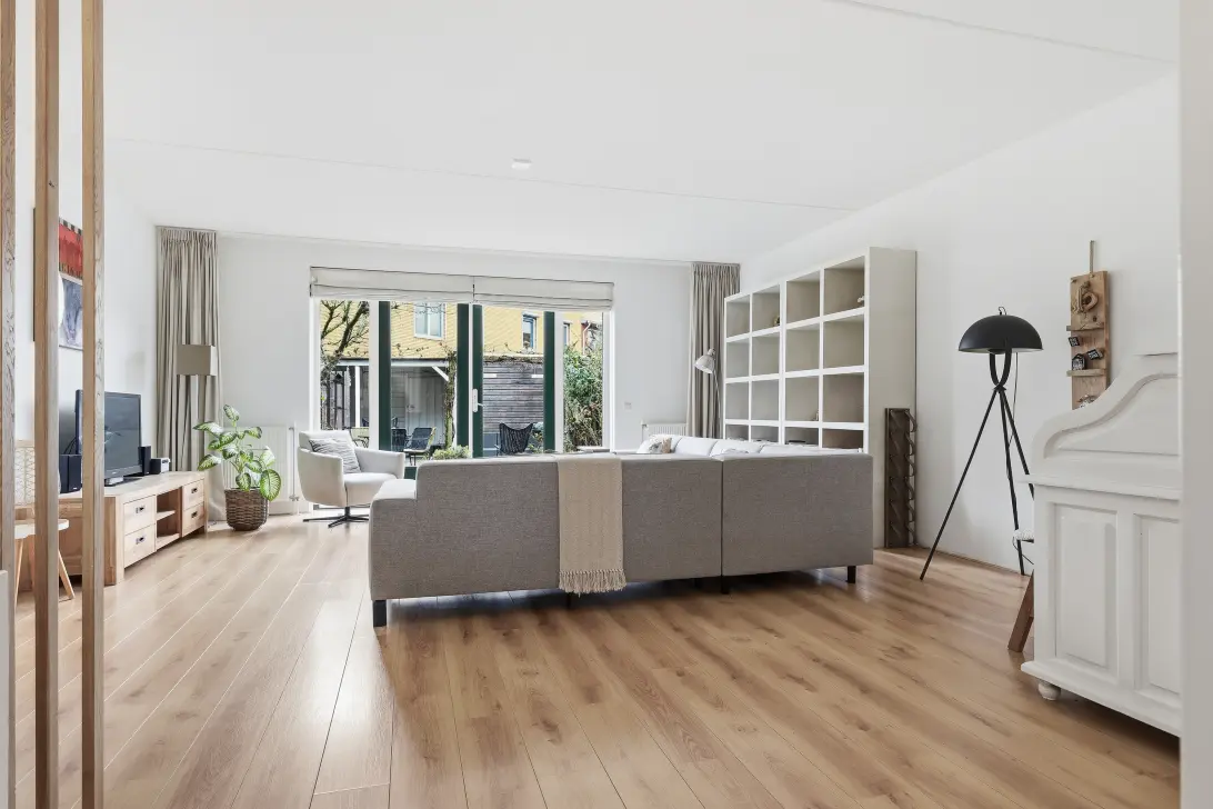 Bij binnenkomst valt direct de royale woonkamer van bijna 40 m² op. Dankzij de grote raampartijen en de openslaande deuren naar de achtertuin is de ruimte heerlijk licht. De royale afmetingen bieden volop mogelijkheden voor een flexibele indeling: een comfortabele zithoek, een grote eettafel en zelfs een speelhoek of werkplek – het past hier moeiteloos. De breedte van bijna 5,7 meter (binnenmaat) geven net dat beetje meer waar velen naar opzoek zijn.