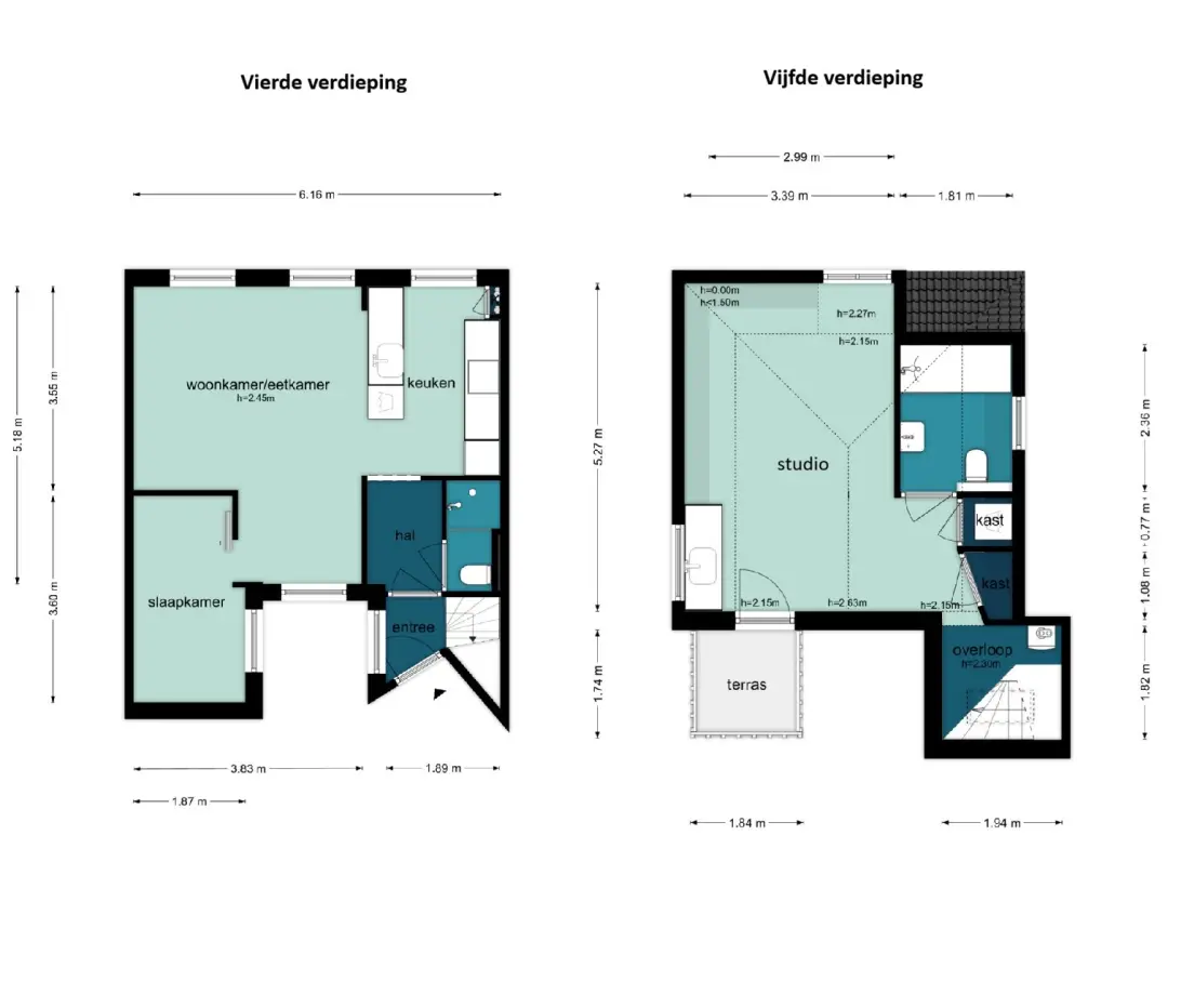 De 5e verdieping is omgebouwd tot een ruim studioappartement. Hier kun je, indien gewenst, extra/aparte slaapkamers creëren door het plaatsen van wanden. Deze verdieping beschikt over een ruime badkamer met ligbad. De houten balken die het dak dragen geven de ruimte een aantrekkelijke sfeer. Daarnaast is er toegang tot een balkon met ruim zicht.
