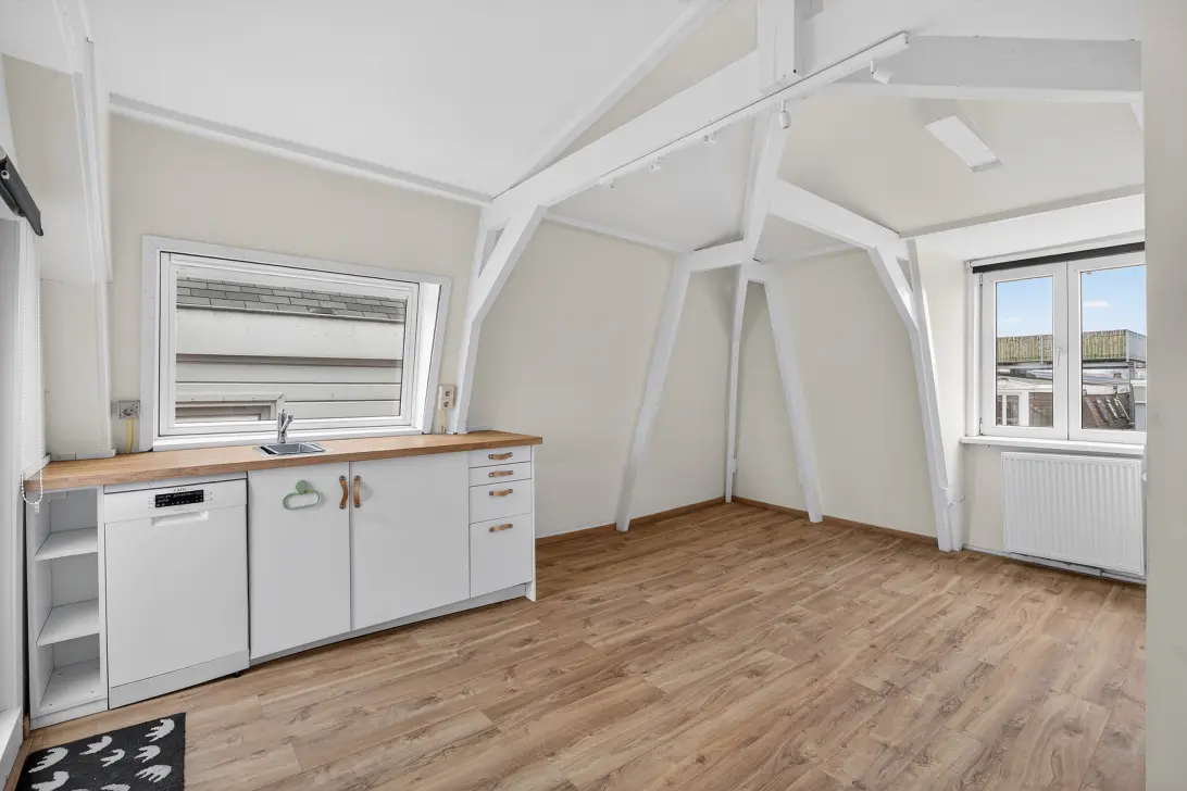 The 5th floor has been converted into a spacious studio apartment. Here, if desired, you can create extra/separate bedrooms by installing walls. This floor has a spacious bathroom with a bathtub. The wooden beams that support the roof give the space an attractive atmosphere. There is also access to a balcony with a spacious view.