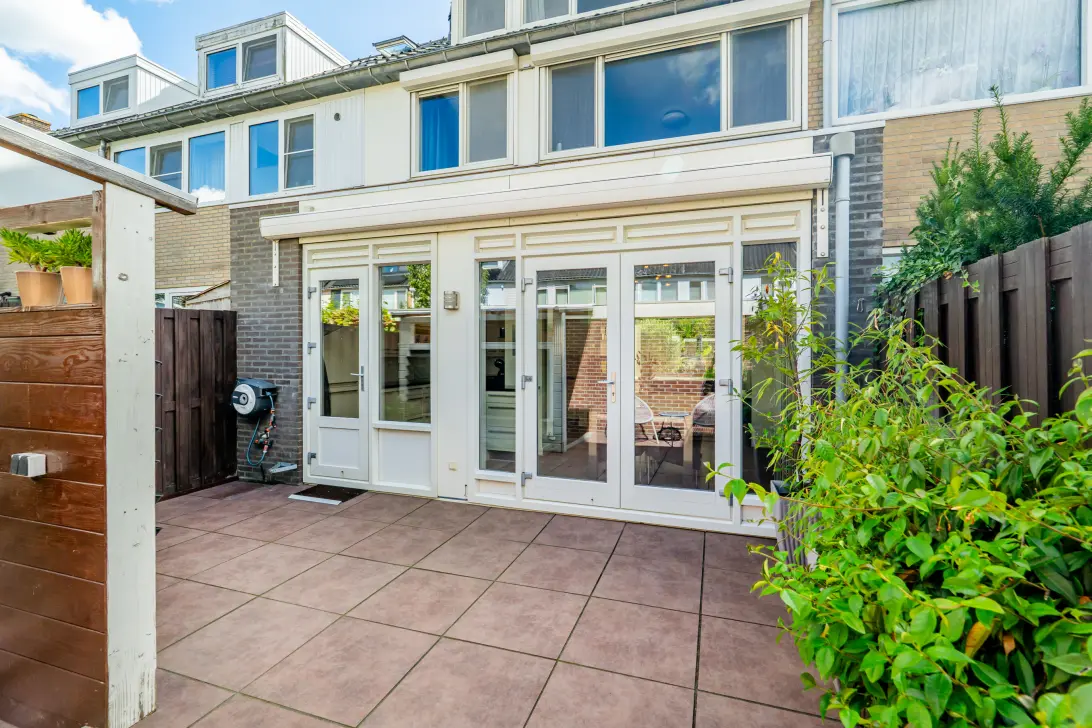 The backyard faces northwest and can be accessed through the French doors from the living room and through the back entrance. At the back of the garden is a nice canopy, ideal for storing your bicycle and lounge set cushions, for example.