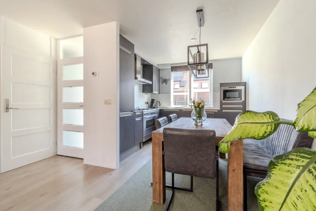 Via de hal stap je de lichte woonkamer binnen. Aan de voorzijde vind je een gezellige zithoek met grote ramen die zorgen voor veel daglicht. Aan de achterzijde ligt de keuken, compleet met inbouwapparatuur en voldoende ruimte voor een royale eettafel. De woonkamer is afgewerkt met een strakke laminaat-vloer. Vanuit de hal bij de keuken, waar zich ook het toilet bevindt, loop je zo de achtertuin in.