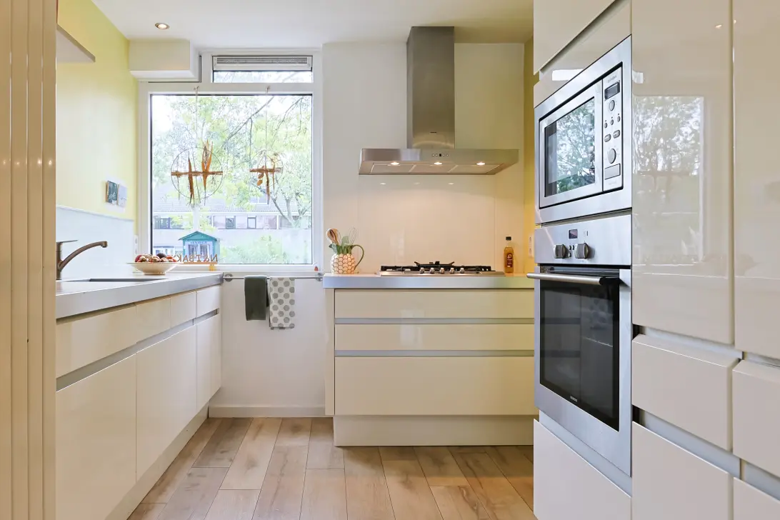 De open keuken ligt aan de voorzijde en biedt een fraai uitzicht over de singel. De keuken is uitgerust met diverse inbouwapparatuur: een vaatwasser (2020), koelkast, vriezer, oven, magnetron, 5-pits gaskookplaat en close-in boiler. De laminaatvloer en nette afwerking zorgen voor een verzorgde uitstraling.