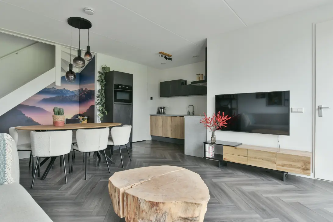 Je komt binnen in de hal die toegang geeft tot het toilet en de woonkamer. De indeling van de woonkamer is verrassend. Bij de voorgevel tref je de perfecte plek voor een zithoek. Aan de rechterachterzijde staat een hippe hoekkeuken met fronten van hout- en betonlook.