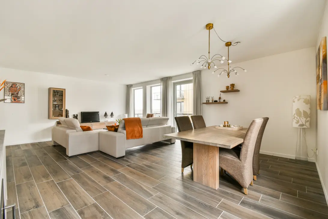 Ruimte en licht: De woonkamer en leefkeuken vormen het hart van de woning, met grote ramen die zorgen voor een prachtige lichtinval en een heerlijk gevoel van ruimte.
