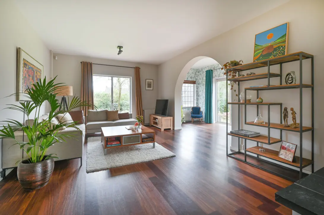 * Zeer ruime woonkamer met ramen rondom, openslaande en schuifdeuren naar de tuin, een gashaard en parketvloer.