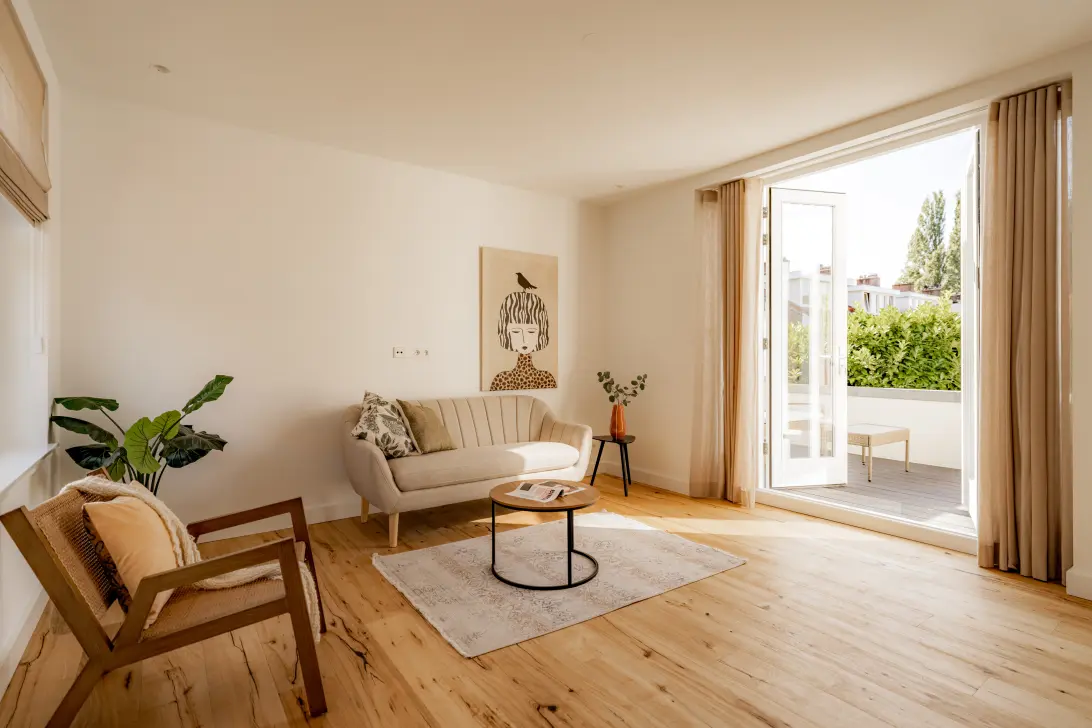 Dankzij ramen aan twee zijden is de woonkamer bijzonder licht en bovendien direct verbonden met een groot terras op het zuiden.