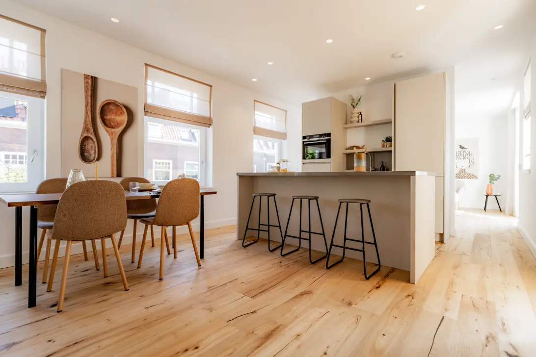 De woonkamer is maar liefst vijf ramen breed en wordt in het midden verdeeld door een stijlvol kookeiland.