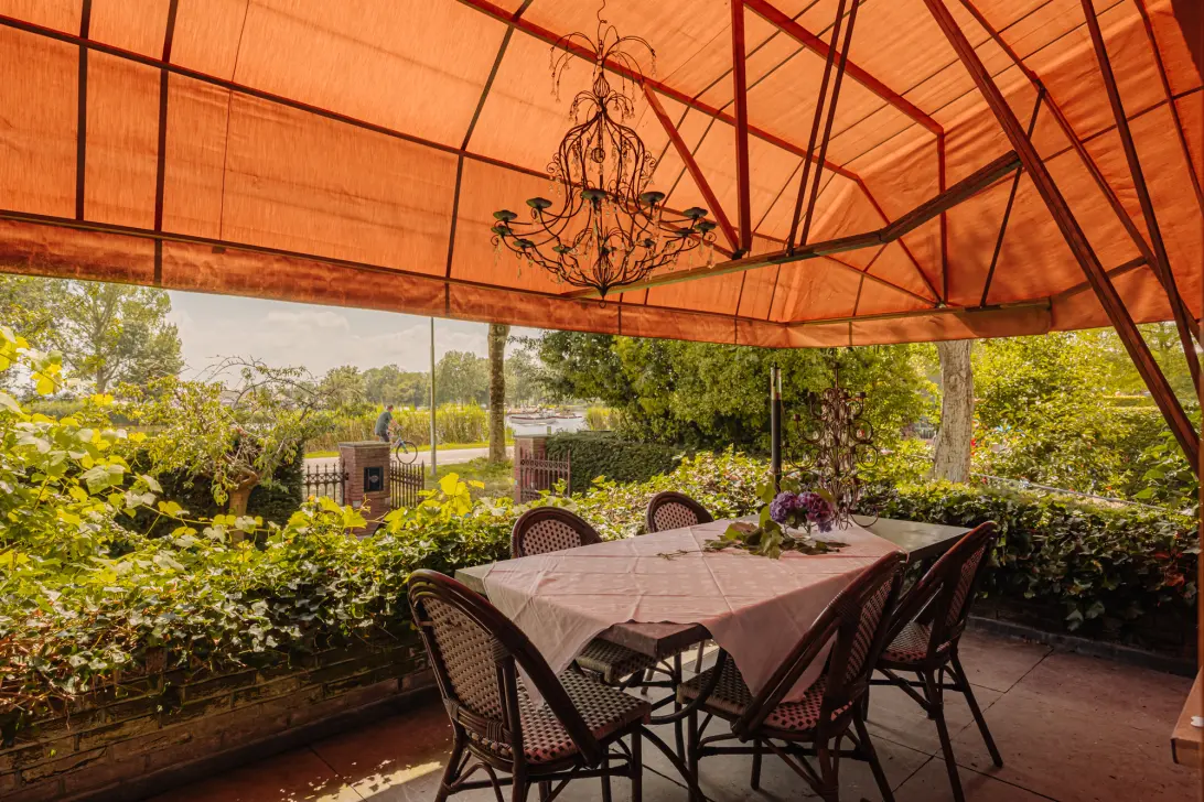 Entree via een stenen bordestrap, hal, toiletruimte met fonteintje, tussenhal met prachtige houten deuren van een voormalig Belgisch bankgebouw en dito bordestrap, intieme woonkamer met open haard en een aangrenzend terras met panoramisch uitzicht op De Amstel, fijne woonkeuken met airco, open haard, maatwerk inbouwkasten en een tweede, aangrenzend, diep terras met prachtig uitzicht op de achtertuin en groenrijke omgeving.