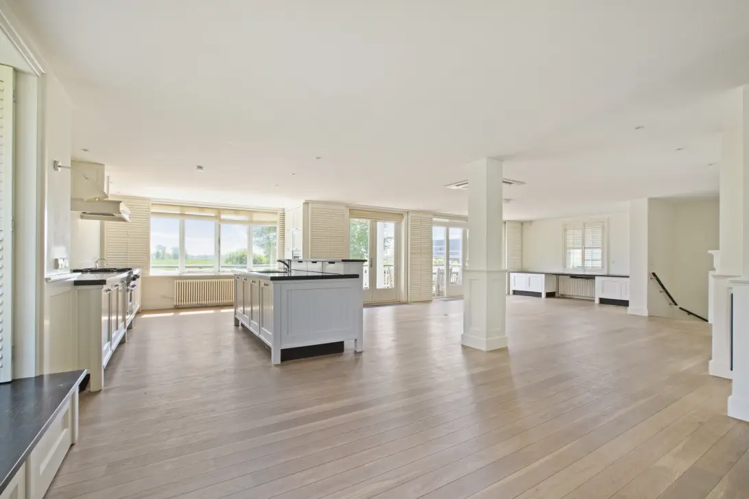 Bij binnenkomst van deze prestigieuze villa wordt u verwelkomd op de eerste verdieping, waar een ruime hal met garderobekast u toegang biedt tot de uitgestrekte en lichtovergoten leefverdieping. Deze bijzonder lichte woonlaag is zorgvuldig ingedeeld in een royaal zitgedeelte, compleet met een elegante open haard aan de zijkant van het pand. De riante open keuken, ontworpen met oog voor detail, vormt het hart van de leefruimte. De aansluitende eetkamer, gelegen aan de voorzijde van het pand, beschikt over een balkon en biedt een panoramisch uitzicht over de Amstel. Aan de achterzijde van de villa zorgen dubbele openslaande deuren voor een vloeiende overgang naar het zonovergoten terras.
