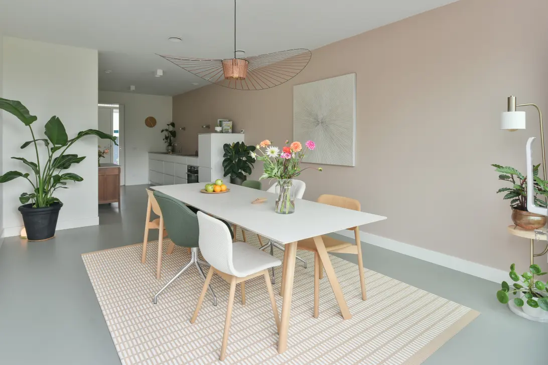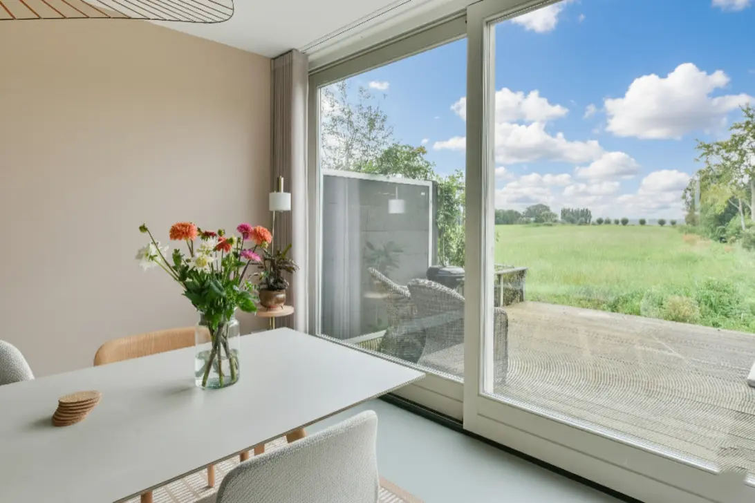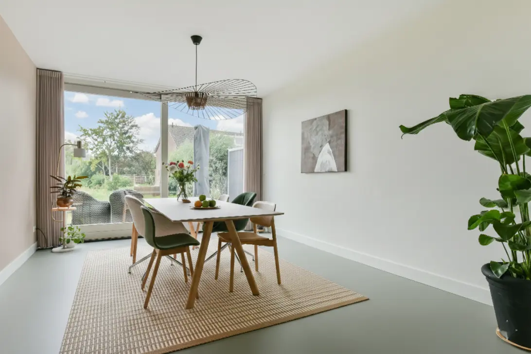 De gehele vloer is afgewerkt met een stijlvolle licht groene gietvloer met vloerverwarming. Dankzij de grote schuifpui brengt de achtergevel heel veel daglicht binnen en kunt u zelfs in de winter genieten van het prachtige uitzicht.