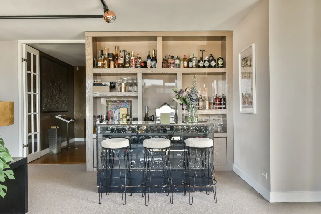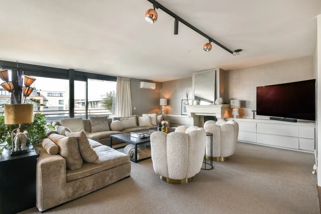 Bij binnenkomst heeft u vanuit de riante hall, toegang tot alle vertrekken in het penthouse. De zeer royale en lichte maar zeker sfeervolle living is voorzien van vloerbedekking, daar de overige ruimtes in het appartement een visgraat eikenhouten vloer beschikken. In de living is een gezellige zit-hoek gecreëerd, voorzien van schouw met gashaard. Aansluitend treft u een fraaie gin bar met ingebouwde kasten, welke een tweede zitgedeelte creëert.
