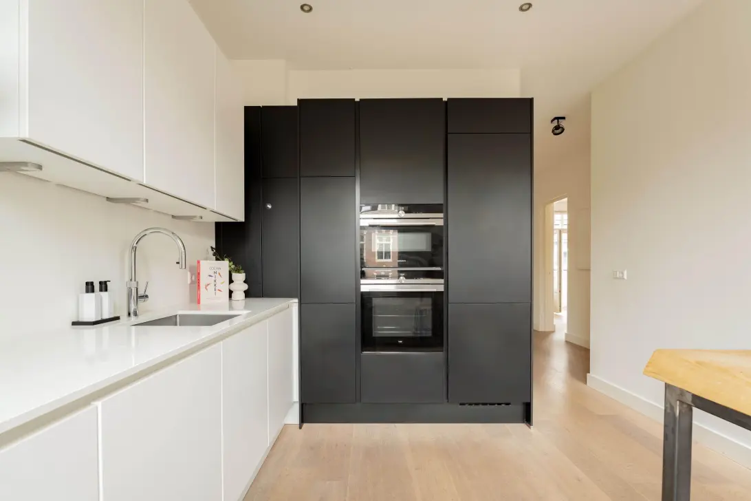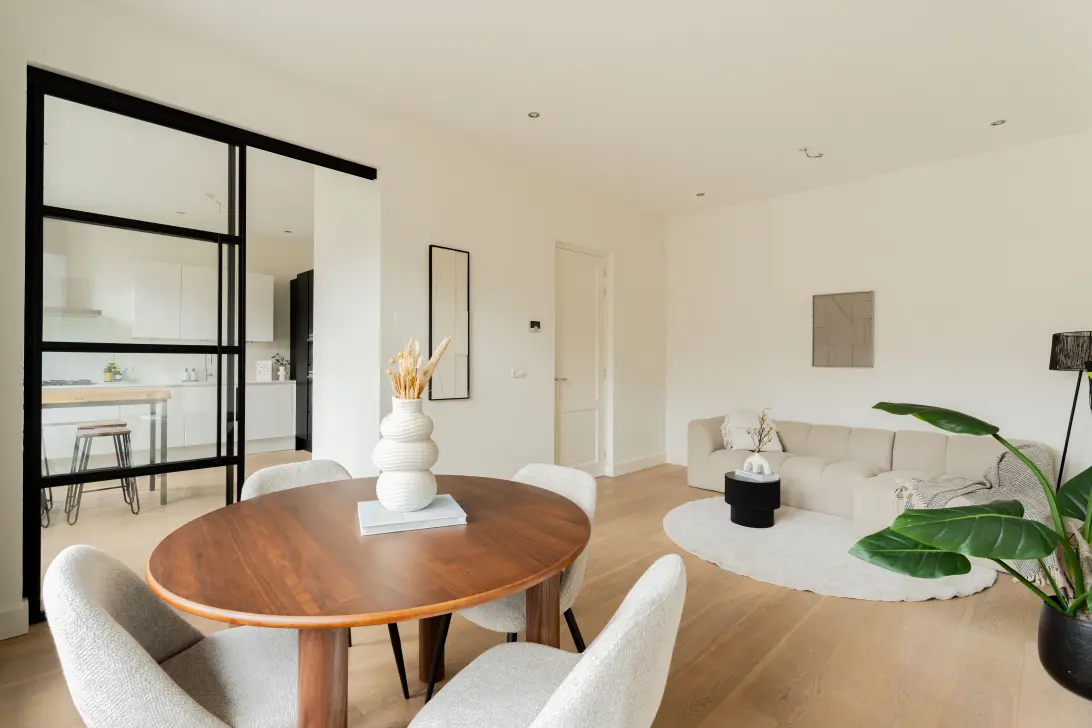 2e Verdieping: De ruime hal geeft toegang tot alle vertrekken. Bij binnenkomst vallen direct hoogwaardige afwerking en de 2,90 meter hoge plafonds op, wat zorgt voor een heerlijk ruimtelijk gevoel. Aan de voorzijde ligt de lichte woonkamer met hoge ramen en een balkon op het westen, waar je kunt genieten van de namiddag- en avondzon. De woonkamer grenst aan de moderne eetkeuken, die is voorzien van Siemens-apparatuur: een Quooker, vaatwasser, vijfpits gaskookplaat, twee ovens en een koel-vriescombinatie.