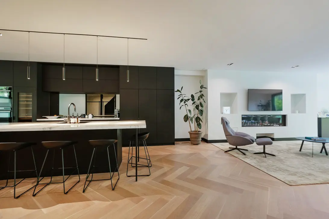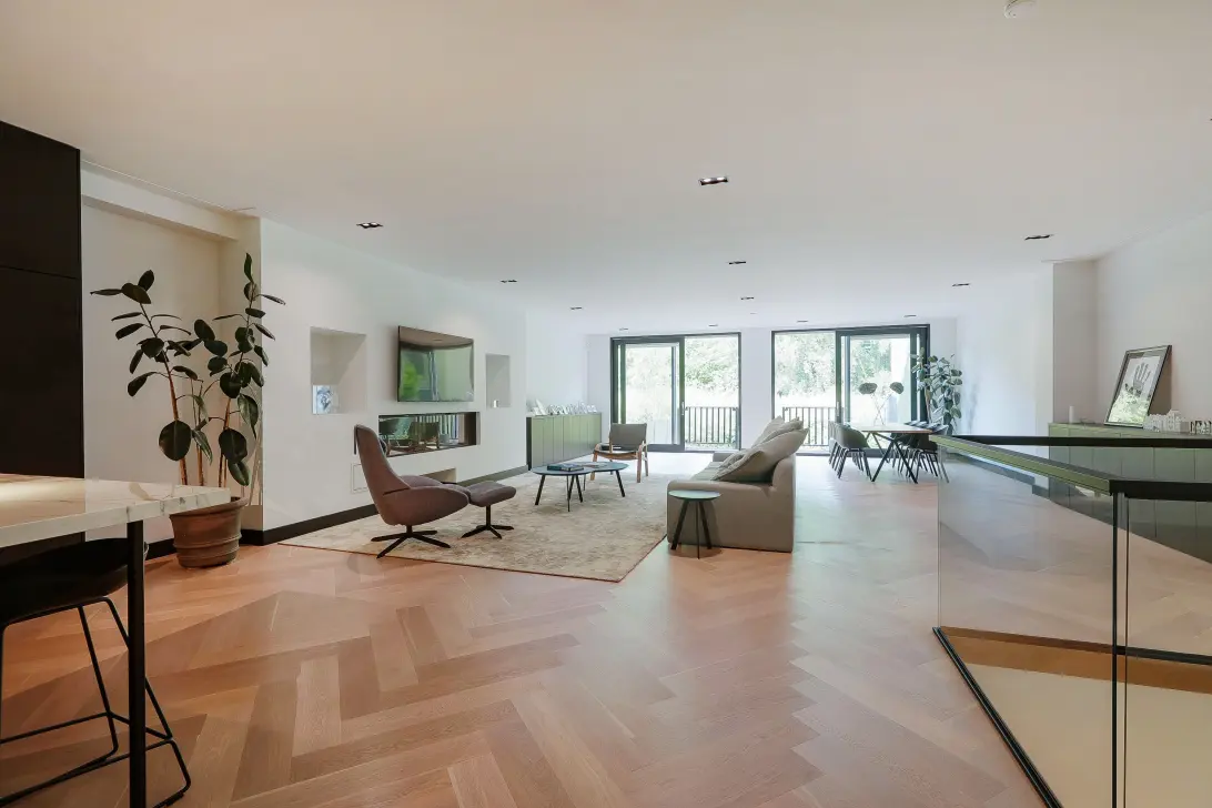 We komen binnen in de gemeenschappelijke entree om vervolgens meteen door te lopen naar de voordeur. Eenmaal binnen komen we in de ruime hal, met toegang naar het toilet, de meterkast en via prachtige openslaande deuren naar de woonkamer. Het eerste dat opvalt is de ultieme kwaliteit van de afwerking en de gigantische afmeting van de woonkamer met zeer luxe open keuken. De prachtige keuken met kookeiland is een absolute blikvanger. De keuken is voorzien van alle luxe inbouwapparatuur die je maar kan bedenken. Dat effect wordt nog versterkt door de gashaard die prachtig in de wand is weggewerkt. Er is ruimte genoeg voor een gezellige eethoek waar je een grote tafel met veel stoelen kwijt kan om gezellig te dineren met een flink gezelschap. Maar dan zijn we er nog niet. Aan de tuinzijde bevinden zich twee schuifpuien die u bij lekker weer helemaal openzet om optimaal te kunnen genieten van de grote tuin en het prachtige vergezicht in het groen.