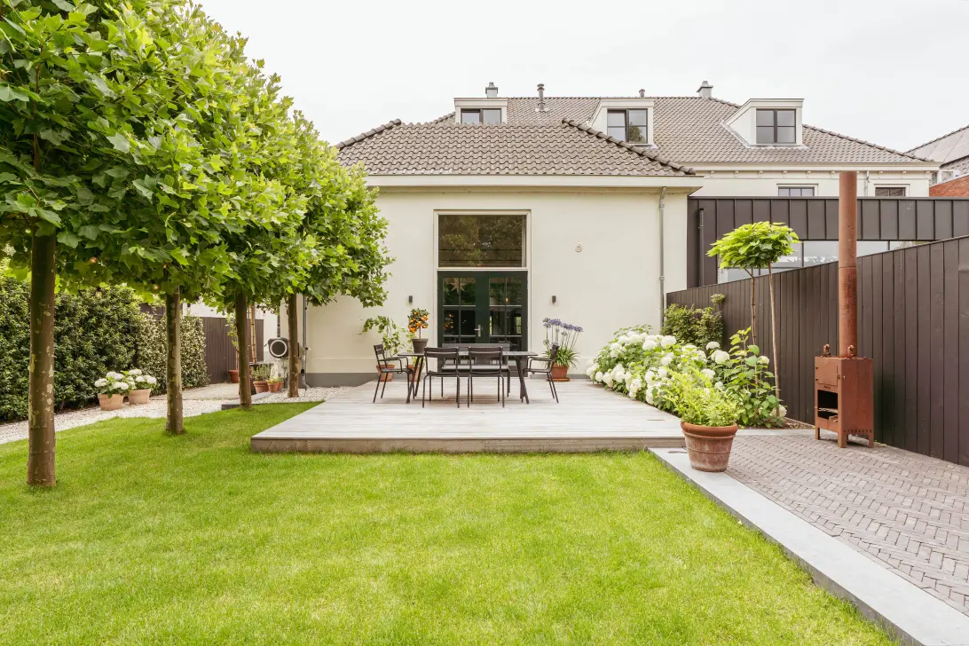 De achtergevel met indrukwekkende glazen pui zorgt voor een natuurlijke ‘inside to outside’ beleving van de tuin (circa 270 m2) waar dankzij een afgewogen gebruik van kleuren en materialen, de woonkamer en keuken natuurlijk overlopen naar het groen van buiten, het vergrijsde vlonderterras en de luwte van het tuinhuis.