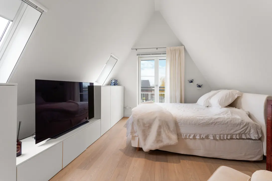 Op de bovenverdieping ligt een prachtige eiken vloer, opnieuw met vloerverwarming. De royale slaapkamer is licht, warm en voorzien van maatwerk kasten. Dakramen en openslaande deuren zorgen voor lucht en daglicht.
