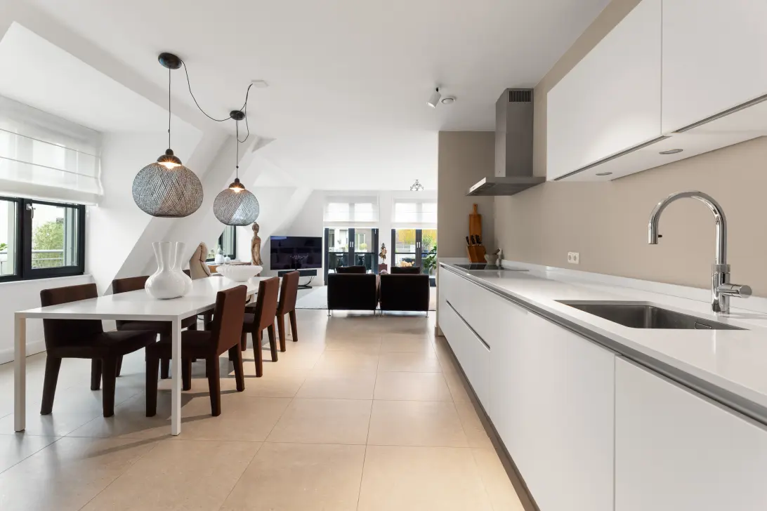 De moderne keuken in fris wit is voorzien van alle inbouwapparatuur (o.a. Siemens), met luxe extra’s zoals een ingebouwde koffiemachine, stoomoven en oven. Dankzij de twee dakkapellen is er plek genoeg voor een royale eettafel, ideaal voor lange avonden tafelen of thuiswerken.