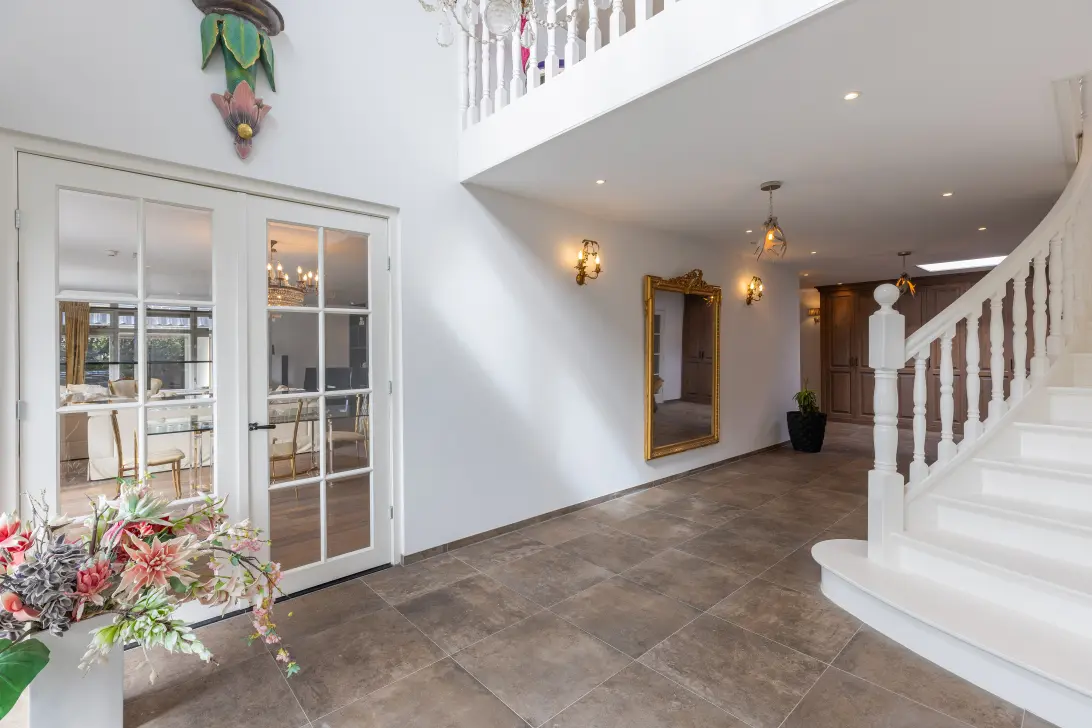Alle ruimtes in deze woning zijn groot en royaal. De wanden en plafonds zijn gestukt. Onder de stenen vloeren ligt vloerverwarming. Mede door de royale verkeersruimten met de handgemaakte kastenwanden en de kleursamenstelling is dit een fantastisch gezinshuis.