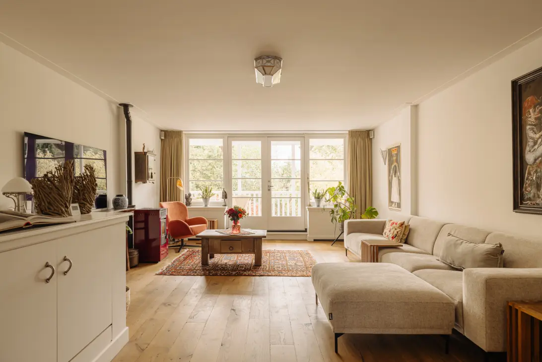 De sfeervolle living ligt aan de achterzijde en heeft een pelletkachel en toegang tot de pandbrede veranda in klassieke stijl. Een trap leidt naar de lagergelegen woonkeuken.