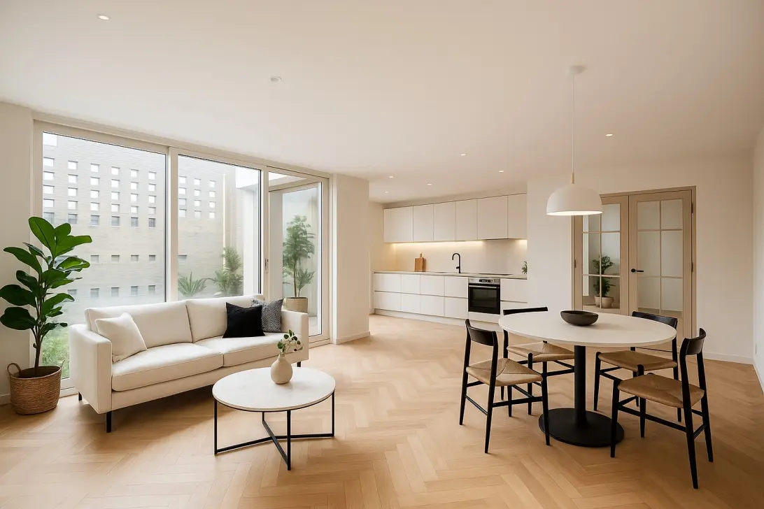 De royale woonkamer is heerlijk licht dankzij de grote ramen en biedt voldoende plek voor een fijne zithoek en ruime eethoek. De open keuken is van alle gemakken voorzien.