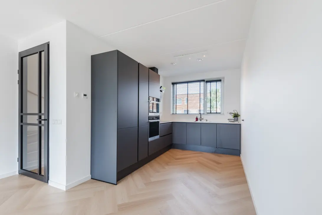 De moderne, L-vormige keuken bevindt zich aan de voorzijde van het huis en is voorzien van een inductiekookplaat, Quooker kraan, combimagnetron/oven, stoomoven/oven, koelkast, vriezer en een vaatwasser.