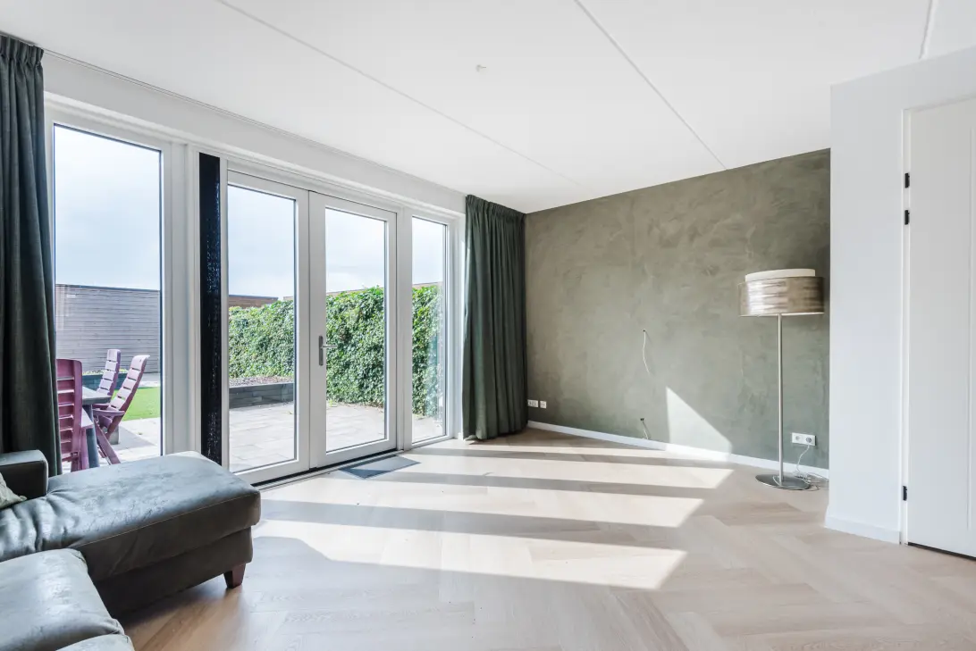 De lichte woonkamer is tuingericht en afgewerkt met een visgraatmotief PVC-laminaatvloer.