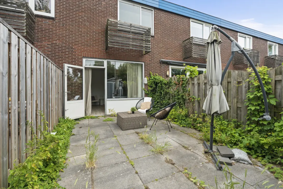 Via de entree kom je in de hal met toegang tot het separate toilet en een ruime bergkast, ideaal voor voorraad of bijvoorbeeld de stofzuiger. De lichte woonkamer staat in verbinding met de keuken aan de achterzijde, voorzien van een losse koelkast, vaatwasser en een gasfornuis met vier pitten. Vanuit de keuken heb je toegang tot de achtertuin op het westen, waar je vanaf de middag heerlijk in de zon zit. Achterin de tuin vind je een praktische achterom met poort – super handig voor bijvoorbeeld het stallen van fietsen in de eigen tuin.