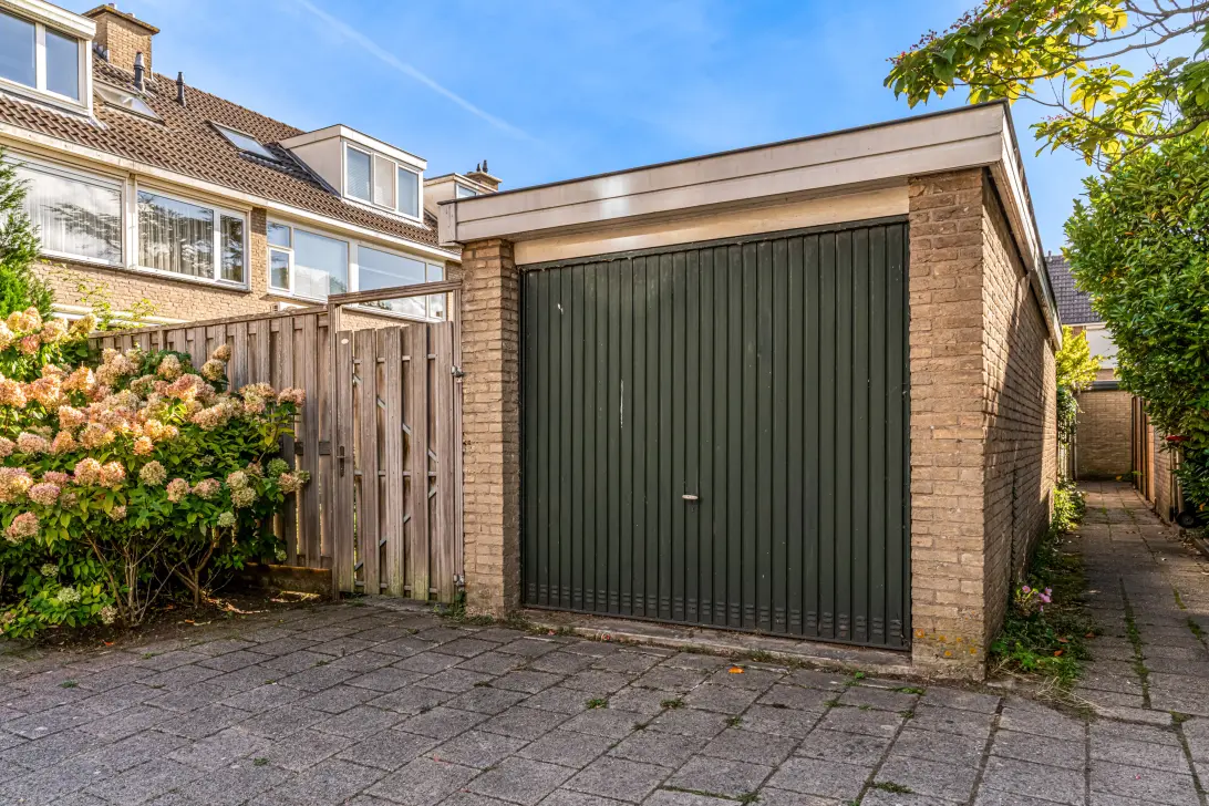 De circa 10 meter diepe achtertuin op het noordwesten is mooi van formaat en biedt toegang tot de ruime garage met elektra. Op de achtergevel van de woning bevinden zich een elektrisch zonnescherm en een buitenkraan.