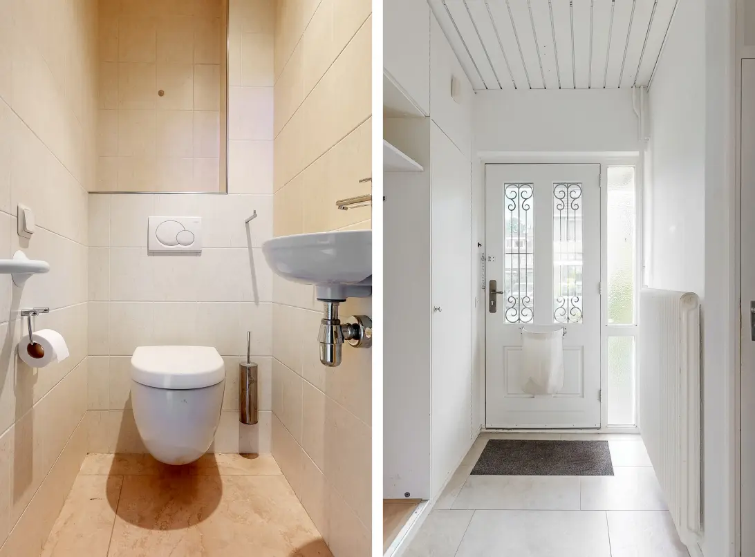 Entree met garderobe, meterkast met 8 groepen, aardlekschakelaars en de gas- en elektrameters. Toilet met wandcloset en fonteintje (uitgevoerd in wit/beige). Speelse Z-vormige woonkamer met trapkast, vaste kast en erker aan de voorzijde. Open keuken in U-opstelling met (vaat)wasmachineaansluiting, gaskookplaat, afzuigkap, oven, magnetron, apothekerskast, inbouwspots en een deur naar de achtertuin.