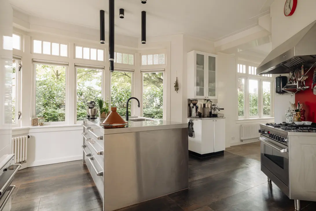"Wat ons nog altijd aanspreekt, is hoe dichtbij alles is, maar het huis toch rust biedt. Binnen vijf minuten zit je op de racefiets in de polder, het Beatrixpark is om de hoek, en zowel De Pijp met de Albert Cuypmarkt als de Beethovenstraat zijn op loopafstand. Toen we het huis kochten, hebben we het volledig laten renoveren onder begeleiding van Peter Geuzenbroek, tweevoudig winnaar van de Zuiderkerkprijs. Het resultaat is een doordacht en comfortabel huis, waarin de keuken het kloppend hart is. Wie via het zijpad binnenkomt — kinderen, vrienden of familie — komt direct in de keuken terecht. Met schuifdeuren is deze ruimte bovendien gemakkelijk af te sluiten, ideaal bij grotere ontvangsten."