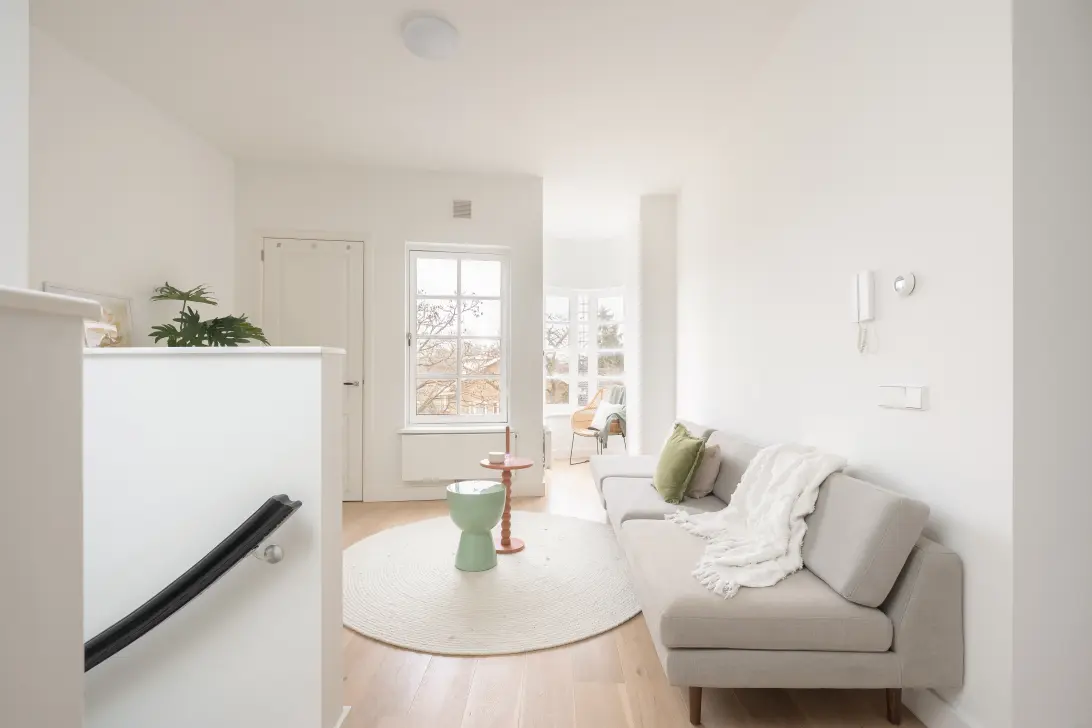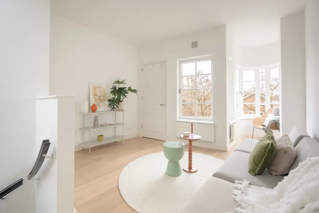 Via de hal leidt de trap naar de woning. Bij binnenkomst kom je direct in de lichte en ruime woonkamer. Dankzij het dakraam en de hoge plafonds voelt de ruimte extra open en prettig aan. De charmante erker vormt een ideale plek voor een leeshoek.