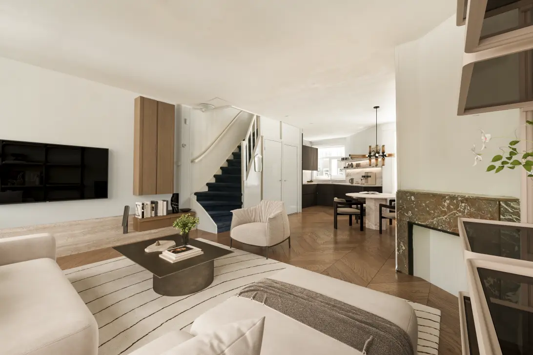 Private entrance on the ground floor with stairs leading to the first floor. From the hallway you step into the living room with open kitchen. At the front, large windows with characteristic stained-glass upper panes provide charm, while at the rear you’ll find the kitchen, equipped with a 4-burner gas stove, combi-microwave oven, and dishwasher. This floor also has a toilet with washbasin.