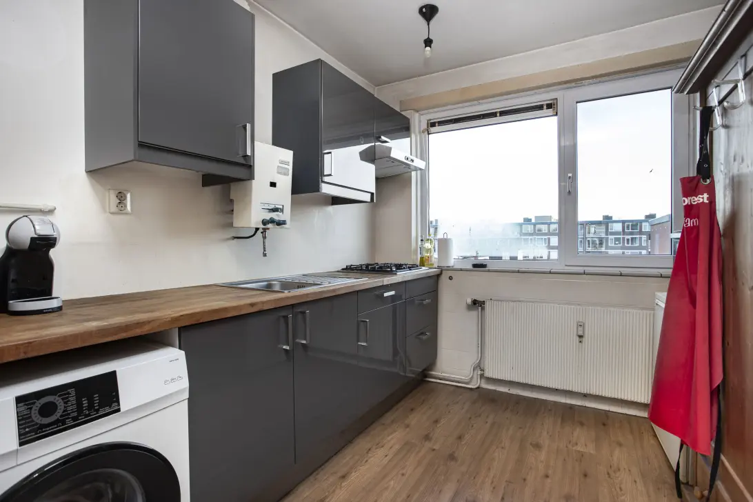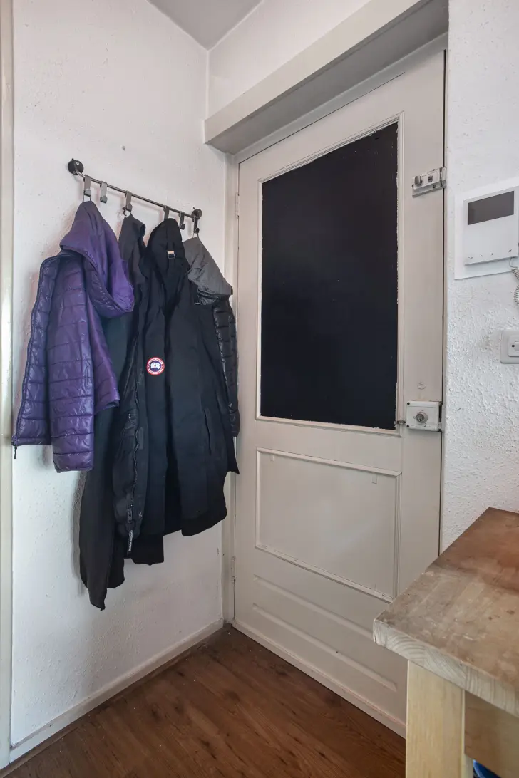 Via de entree kom je in de hal van de woning, die fungeert als het centrale punt van waaruit je toegang hebt tot de verschillende ruimtes. Vanuit de hal bereik je de keuken, het toilet en de woonkamer. De keuken, gelegen aan de voorzijde van de woning, is voorzien van enige inbouwapparatuur als een gaskookplaat en een afzuigkap. Tevens bevindt zich in deze ruimte de aansluiting voor de wasmachine.