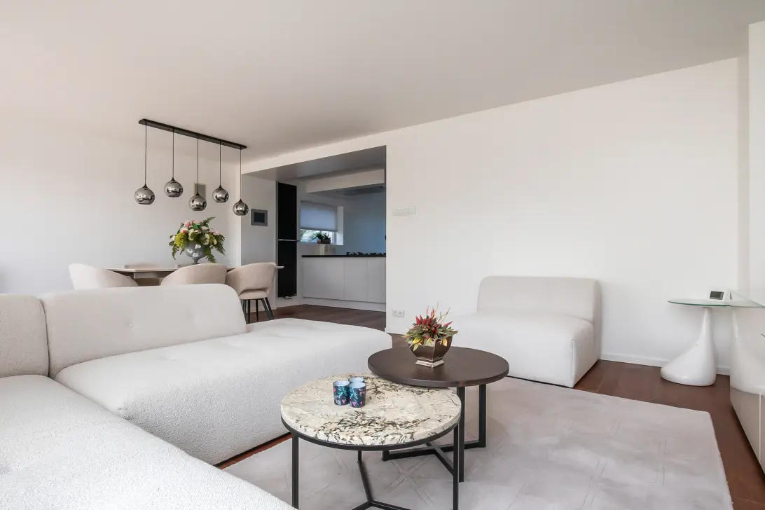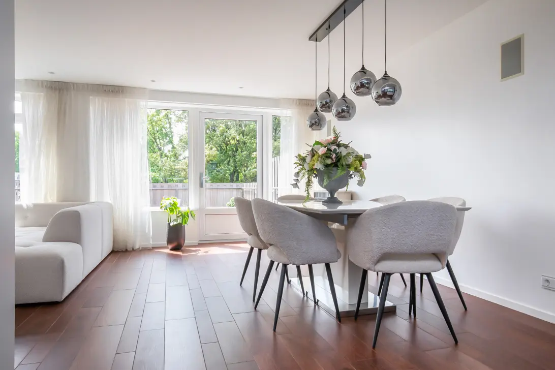 De woonkamer is heerlijk licht door de grote ramen en is voorzien van houtlook keramieke vloertegels met vloerverwarming.