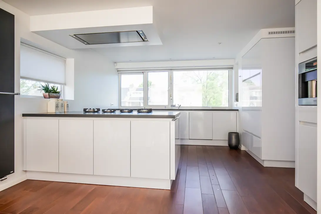 Eerste verdieping: entree in hal met bergruimte, meterkast en toilet met fontein. Royale woonkamer met luxe open keuken. De royale en luxe keuken is voorzien van veel bergruimte, een kookeiland met 4 geïntegreerde gaspitten in het hardstenen werkblad en diverse inbouwapparatuur, te weten: afzuigkap, combi-oven, koffiemachine, koelkast, vriezer, vaatwasser en een Quooker kokend water kraan.