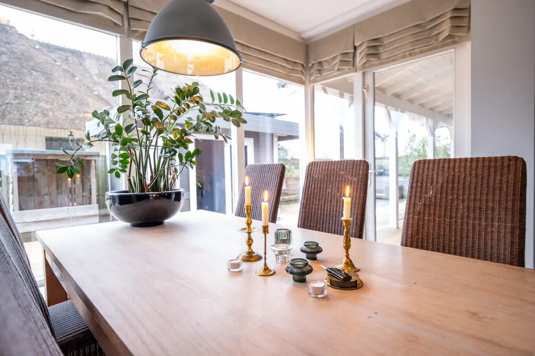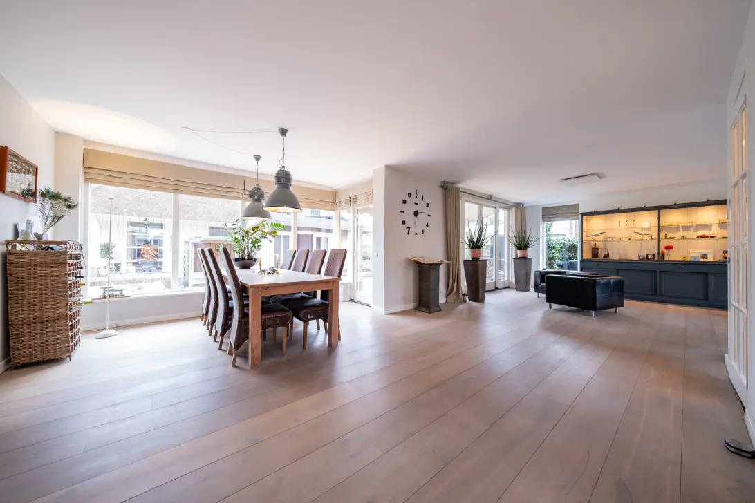 De royale en lichte woonkamer beschikt over een sfeervolle openhaard en grote raampartijen met uitzicht op de tuin. De open keuken in L-opstelling heeft een landelijke tint en is voorzien van divers inbouwapparatuur en een composiet aanrechtblad. De keuken biedt volop werk- en bergruimte en sluit naadloos aan op de leefruimte, waardoor een prettige en functionele indeling ontstaat. Deze woning is instapklaar: zonder verbouwingswerkzaamheden direct beginnen met genieten.