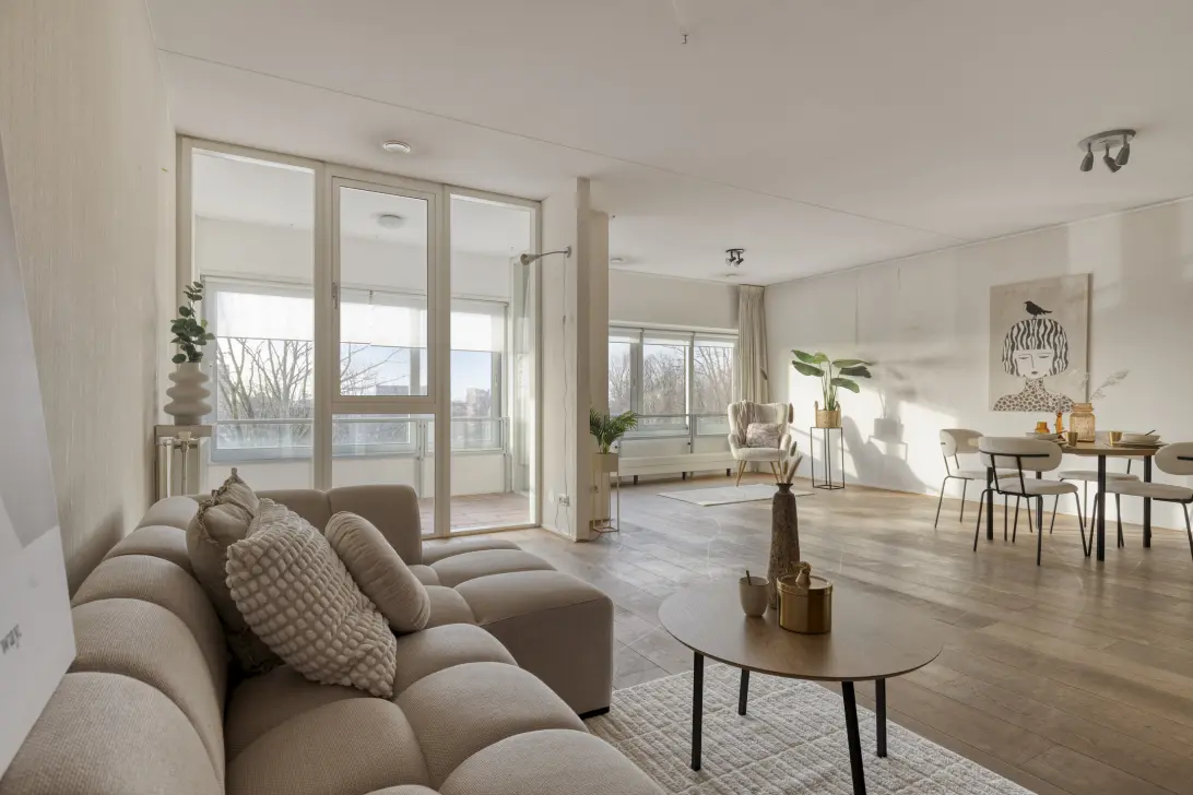 De entree van het appartement bevindt zich aan de kant van de rustige, groene binnenplaats. U komt binnen in een ruime hal die toegang biedt tot alle vertrekken van de woning. De lichte en ruime woonkamer, gelegen aan de voorzijde van het complex, is voorzien van grote raampartijen en biedt toegang tot de loggia, waar u beschut kunt zitten en genieten van het uitzicht. Dankzij de grote raampartij geniet u van veel natuurlijk daglicht.
