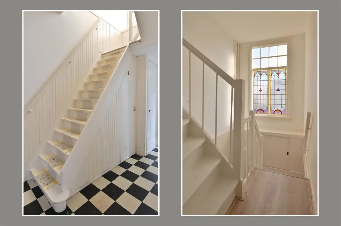 * Bordestrap met glas-in-lood raam, overloop met wasruimte.